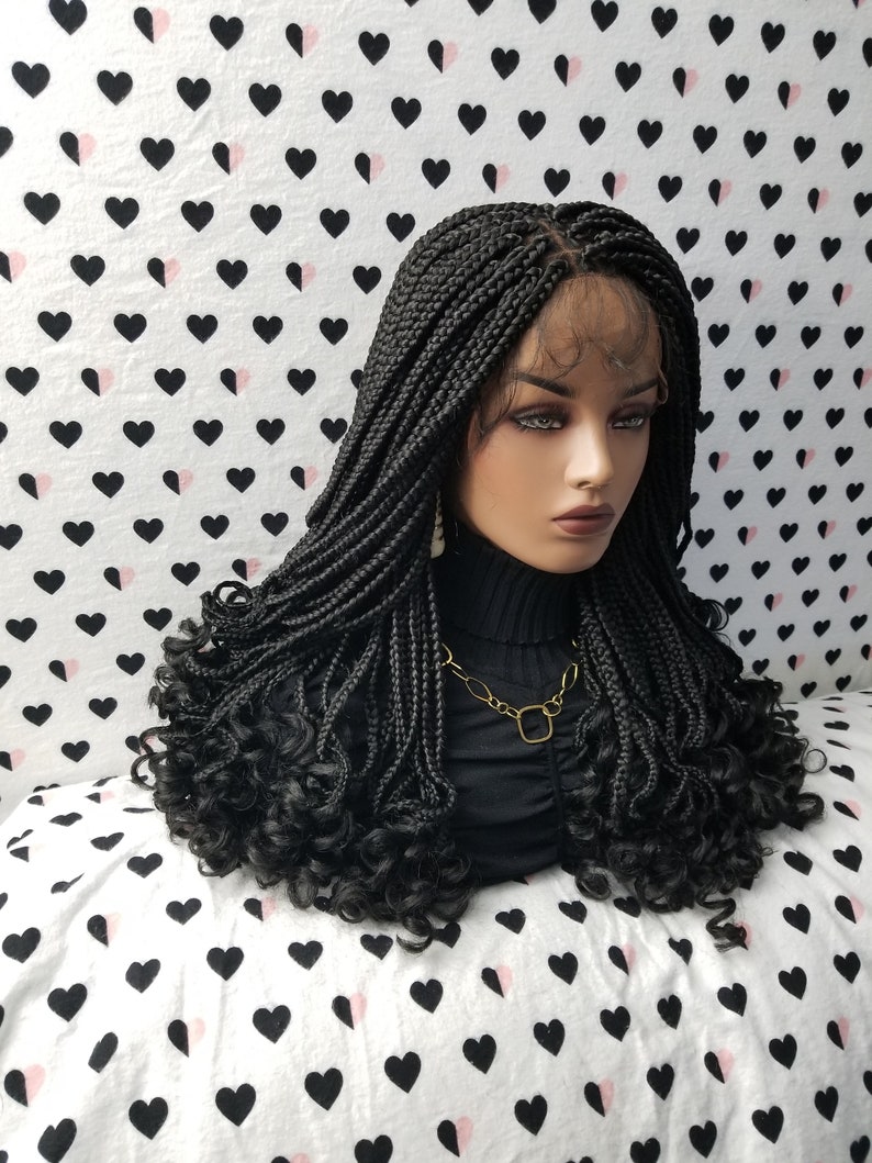 Handmade Braided Lace Wig Goddess Box Braids Lace Front Wig With Curly Tip Ends Color 1b Black